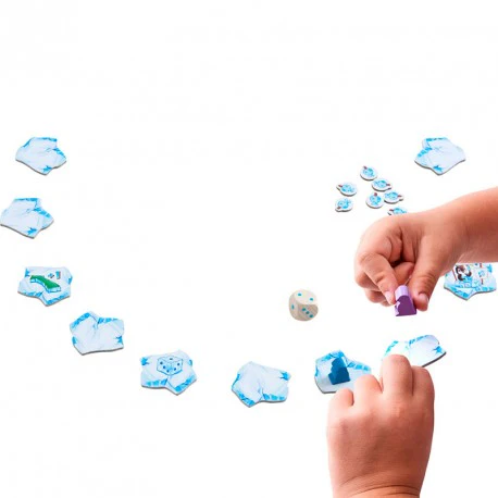 1. Coloca los témpanos de hielo en círculo. Cada jugador elige un pingüino y un marcador del mismo color, situándose detrás del témpano de mamá.