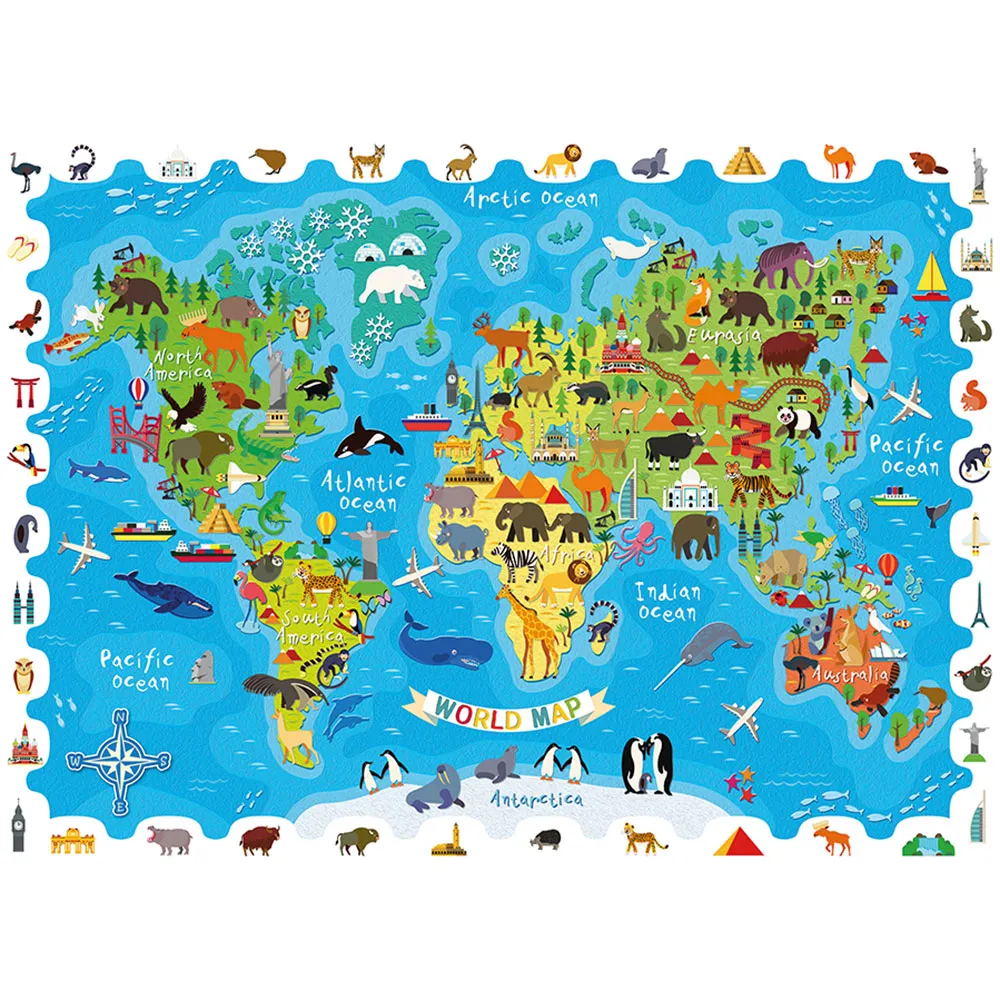 - Monta el puzle: Une las piezas y revela un detallado mapamundi lleno de animales.