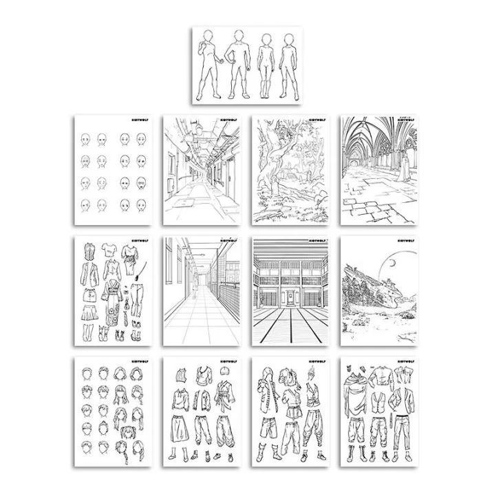 • 21 fichas de dibujo con personajes y ambientes para crear más de 100 combinaciones diferentes.